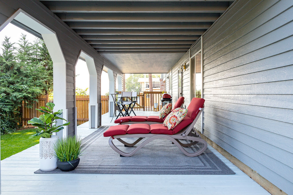 Retreat to lounge chairs, cozy outdoor blankets, pub table, and director’s chairs on the oversize covered deck, where you’ll relax with a glass of wine and enjoy the views of the yard and valley.