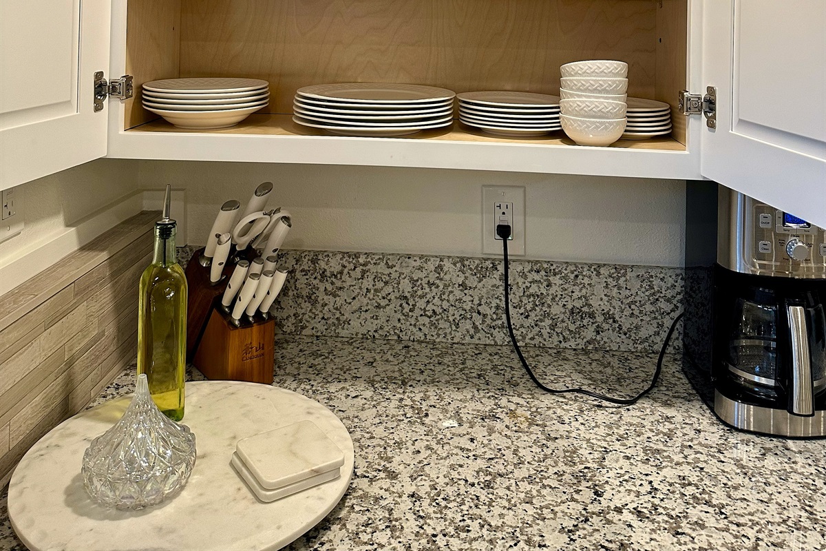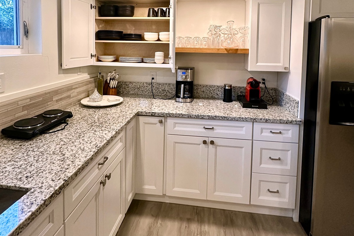 In the kitchenette, you’ll find plenty of glassware and tableware, hot water kettle, coffee maker, and cooking utensils. The flat has a portable warming plate burner (no stove) for cooking a simple meal. Or you may prefer to use the convection microwave or the BBQ on the covered deck. We provide coffee, tea, and spices.