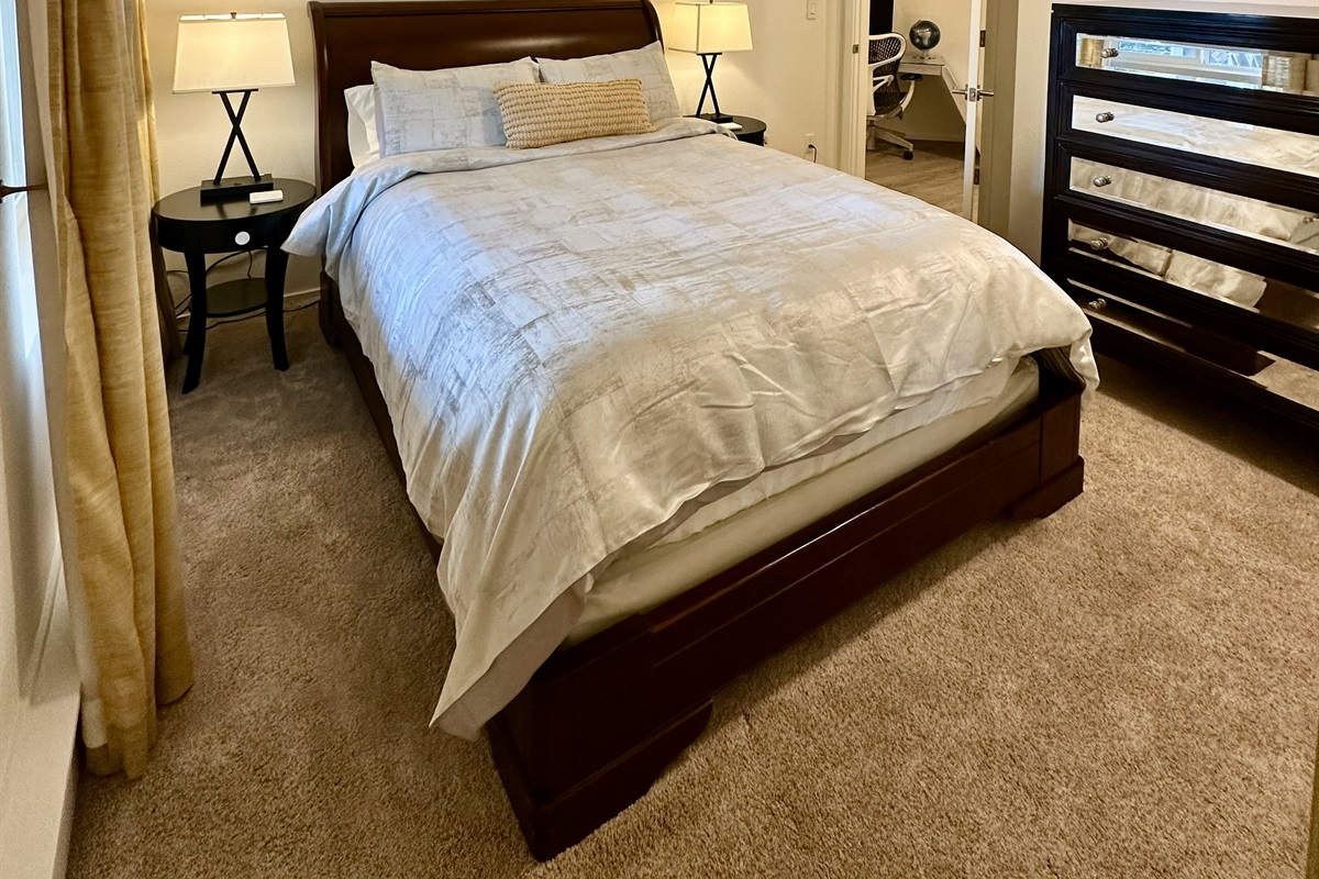 One ample bedroom with a queen sleigh bed, a pillow-top mattress, and a gorgeous view from your bedroom window. The large closet has 2 luggage racks and hangers.